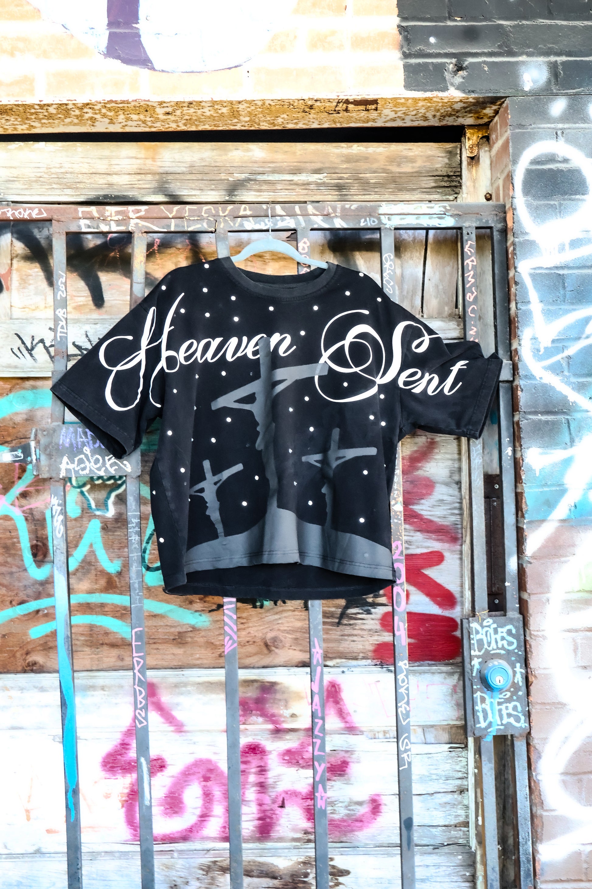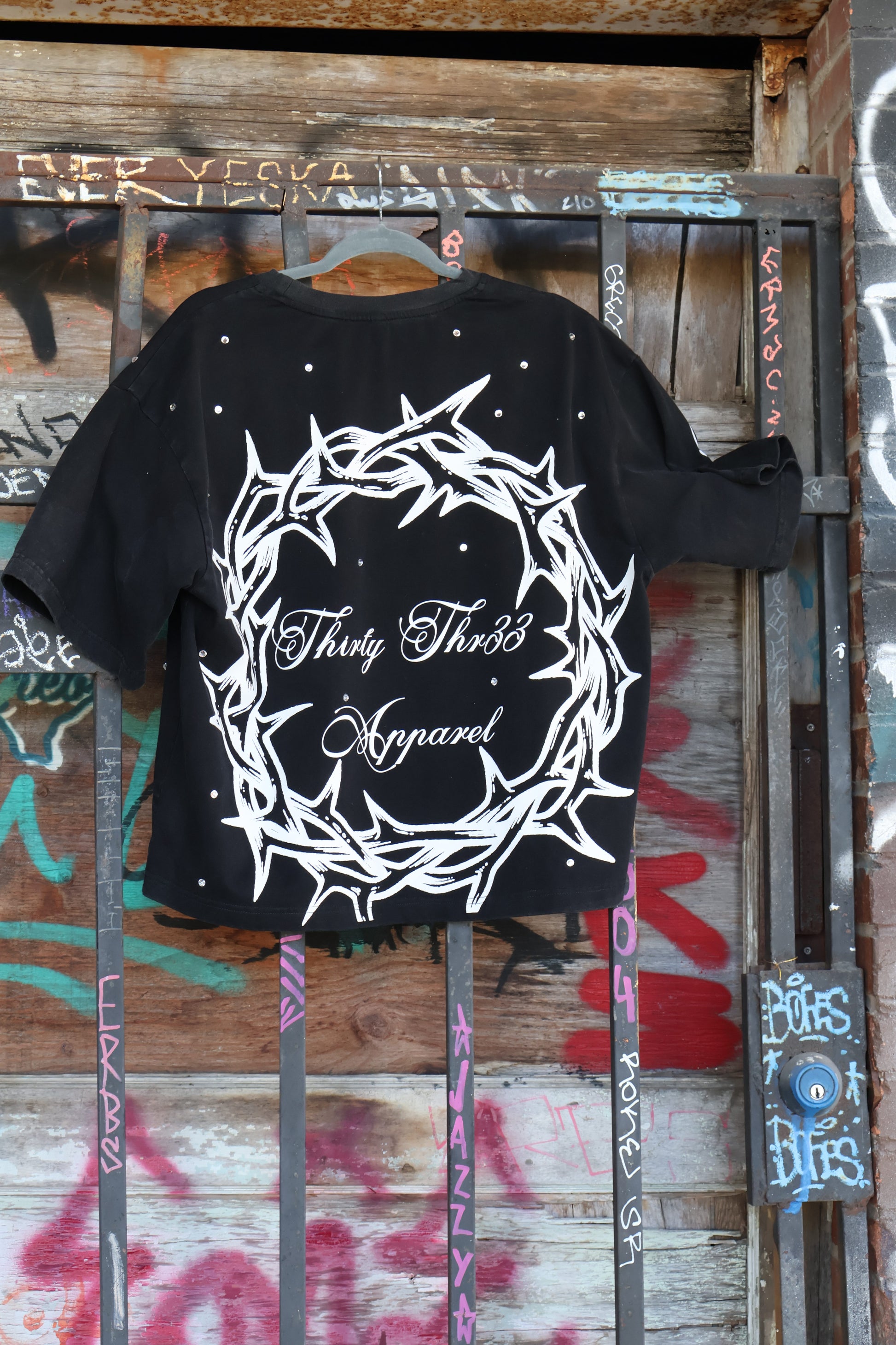 Box fit style shirt with a heavyweight feel to it. The father son and Holy Spirit graphic, with the crown of thorns on the back. Model is 6'2 140 wearing a size medium